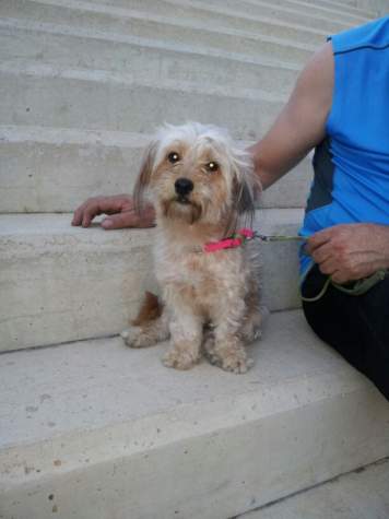 América es una pequeñaja de un año aproximadamente, estuvo atada todo el día en la plaza de un pueblo y al no llevar chip nadie la quiso acoger, hasta que llegaron una pareja que se apiadó de ella.